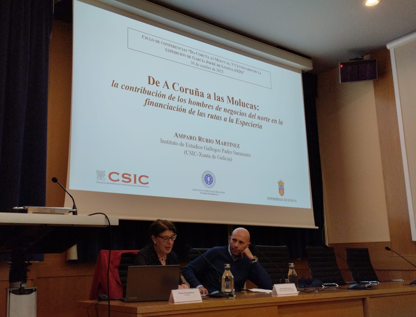 De entre las intervenciones que conforman el ciclo conferencias “Da Coruña ás Molucas. V Centenario da Expedición de García Jofré de Loaysa (1525)”, organizadas por el Instituto José Cornide de Estudios Coruñeses (Ayuntamiento de A Coruña) y coordinadas por José Ricardo Pardo Gato, el 30 de octubre de 2025, en el salón de actos de la Autoridad Portuaria de A Coruña, tuvo lugar la conferencia de la Científica Titular del Centro Superior de Investigaciones Científicas (CSIC), Amparo Rubio Martínez. La conferencia llevó por título “De A Coruña a las Molucas: la contribución de los hombres de negocios del norte en la financiación de las rutas a la Especiería” y la ponente fue presentada por el propio presidente de la Asociación de Historia y Cultura Militar Noroeste, José Ricardo Pardo Gato.