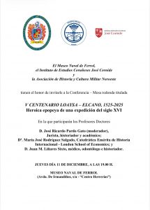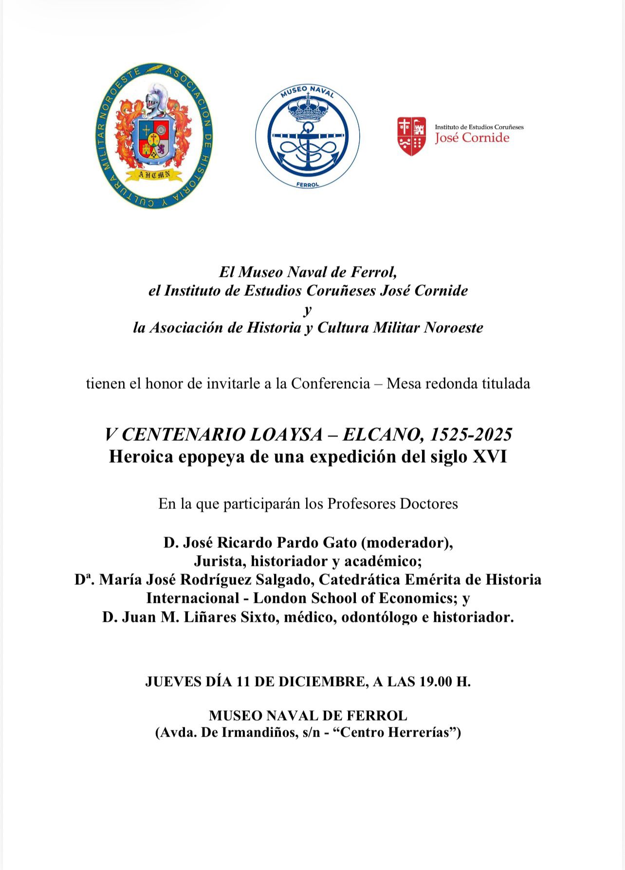 Organizada por la Asociación de Historia y Cultura Militar Noroeste, con la colaboración del Museo Naval de Ferrol y el Instituto de Estudios Coruñeses José Cornide, el jueves 11 de diciembre de 2025 tendrá lugar, en el Museo Naval de Ferrol, la mesa redonda “V Centenario Loaysa-Elcano 1525-2025.